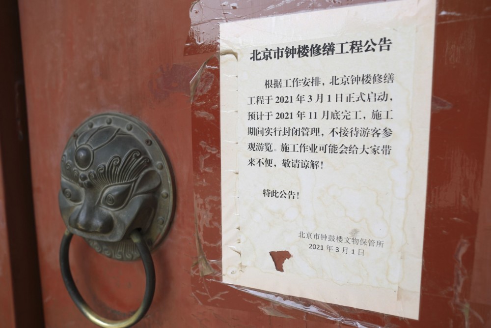 8月6日,钟楼门上贴着修缮公告。新京报记者 浦峰摄